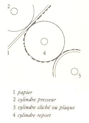 La forme imprimante nest pas en contact direct avec le papier comme dans la lithographie mais avec un cylindre en matière synthétique nommé « blanchet » qui reçoit limage et la reporte sur le papier.