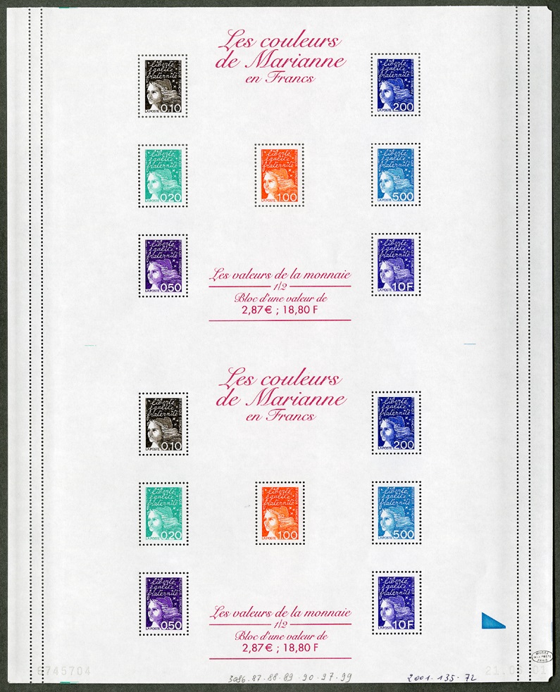(Feuille modèle n° 6745704 au 21.06.01 du bloc-feuille « Les couleurs de Marianne en Francss » avec perforage sur les marges avant découpe)