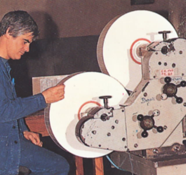 - coupait la bande de timbres en bloc de cinq fois deux timbres avec un perforage sur deux pour couper les carnets à l'emplacement du perforage manquant et obtenir un timbre dentelé trois côtés. La bande de timbres était collée à l'eau par le gommage sur le côté.
