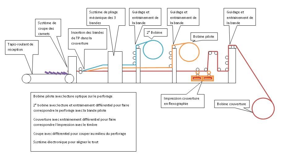 La confectionneuse entraîne trois bandes de papier (2 pour les timbres et la couverture) à la même vitesse de défilement pour les faire coïncider lors de la coupe du carnet.