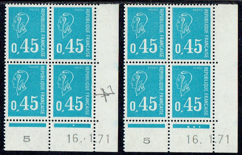 (1er tirage du 0.45 FF bleu « Marianne de Béquet » sur la presse typographique n°5 sans bande phosphorescente)